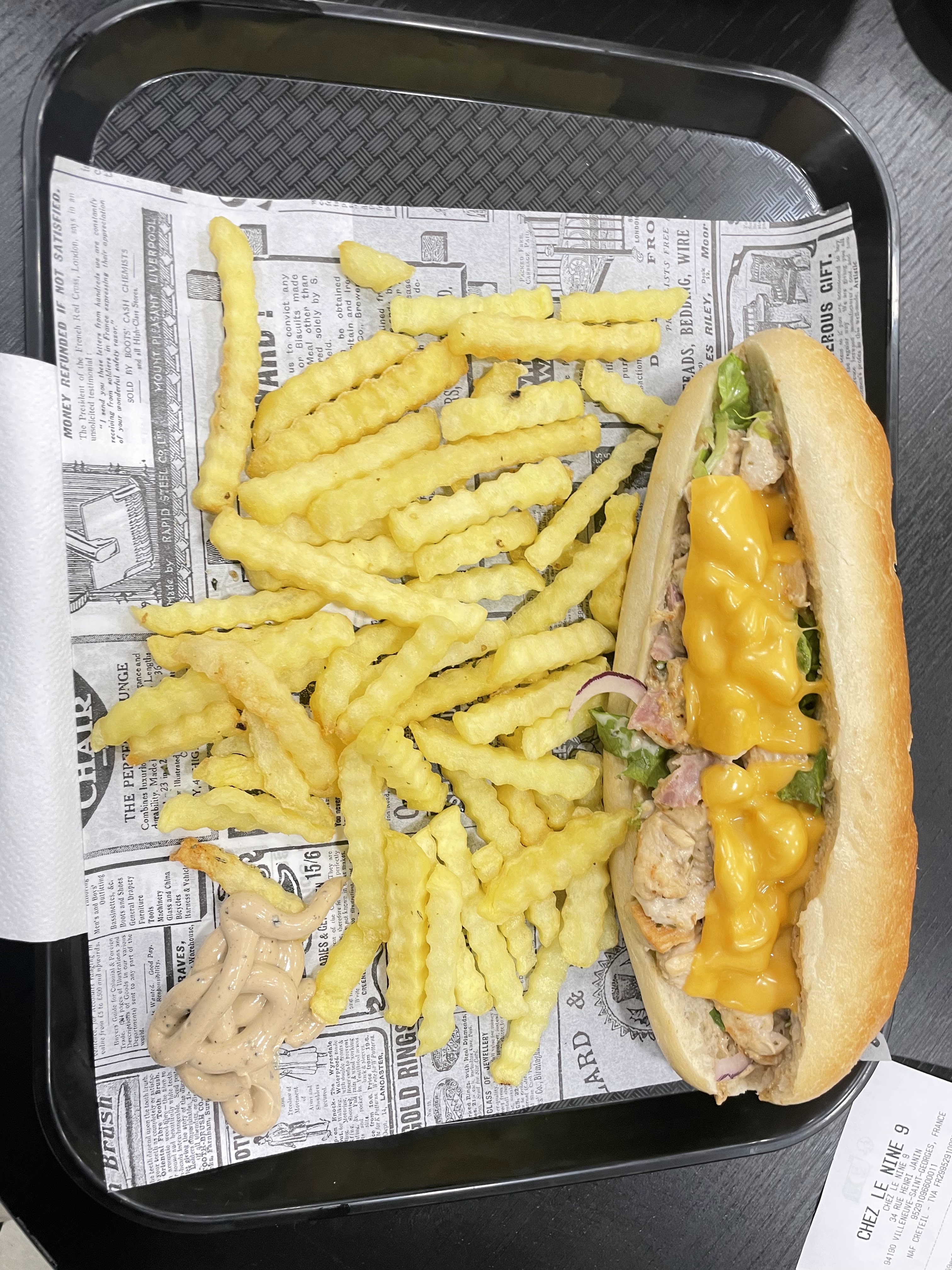 Baguette poulet épicé sur place et non mariné . Fromage cheddar. C'est pas ouf. Bonne 🍟 frites par contre. Pain bon