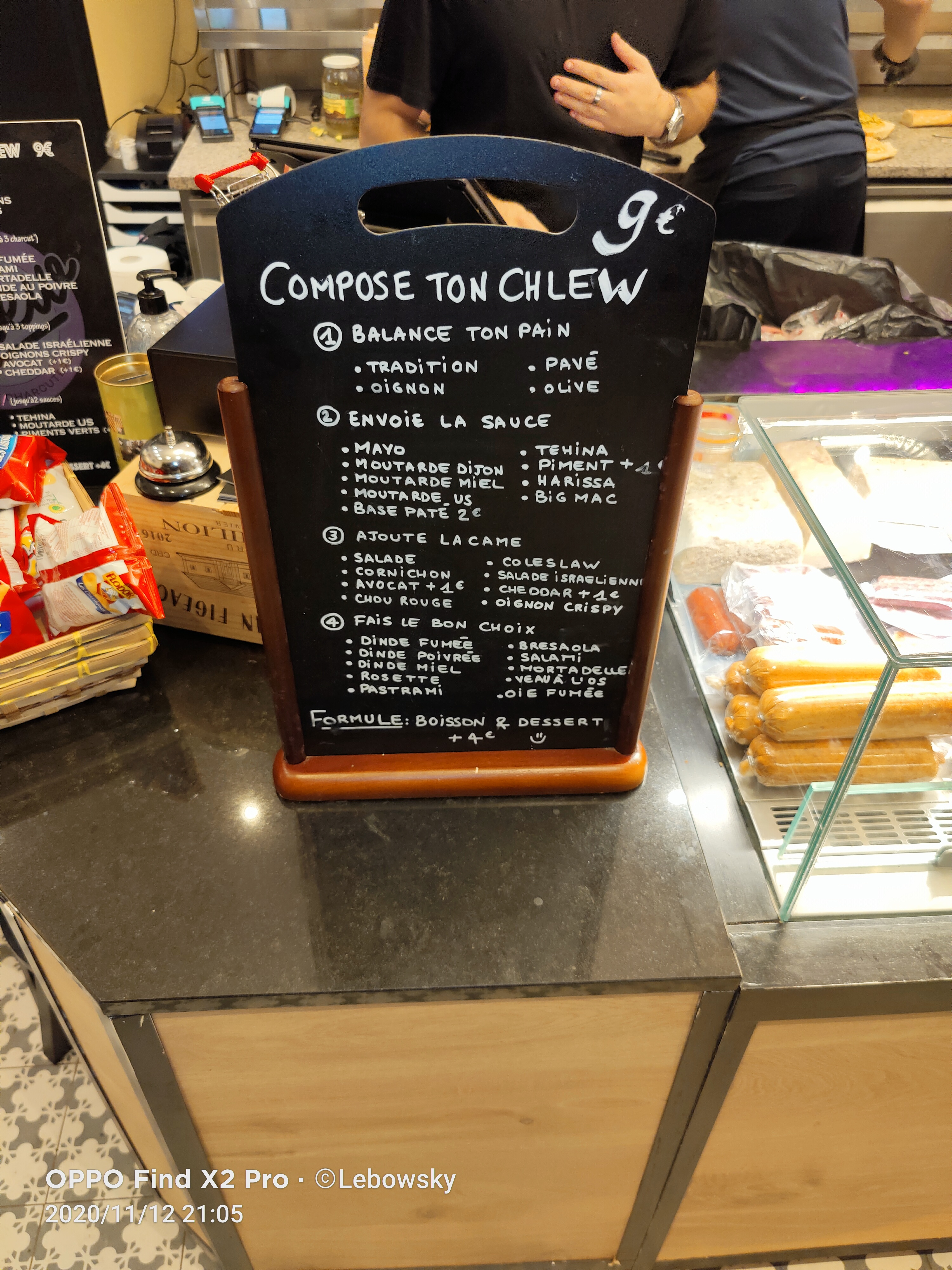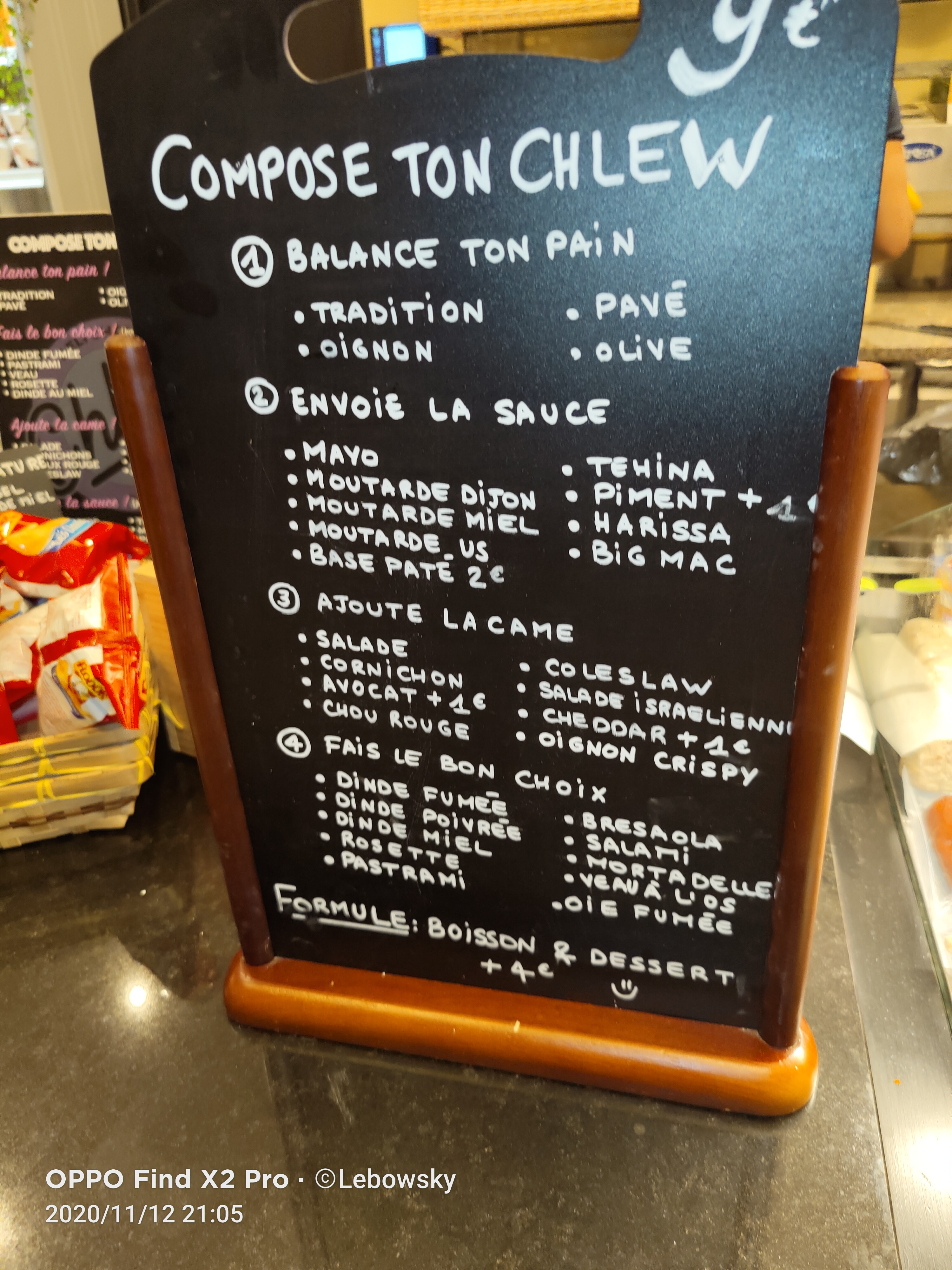 Le Chlew est un sandwich composé de crudités fraîches et de charcuterie. C'est très copieux et j'aime beaucoup. Ce qui est pratique c'est qu'il y a des bornes pour faire sa commande comme chez Burger King. Pas besoin de faire la queue pour commander, on bricole sa petite faim sur l'écran tactile, et on attend d'être appelé par son prénom. L'équipe est très sympa.