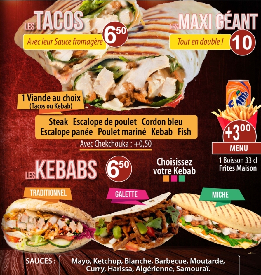 Bons tacos et kebabs, gérants super sympas et prix abordables !