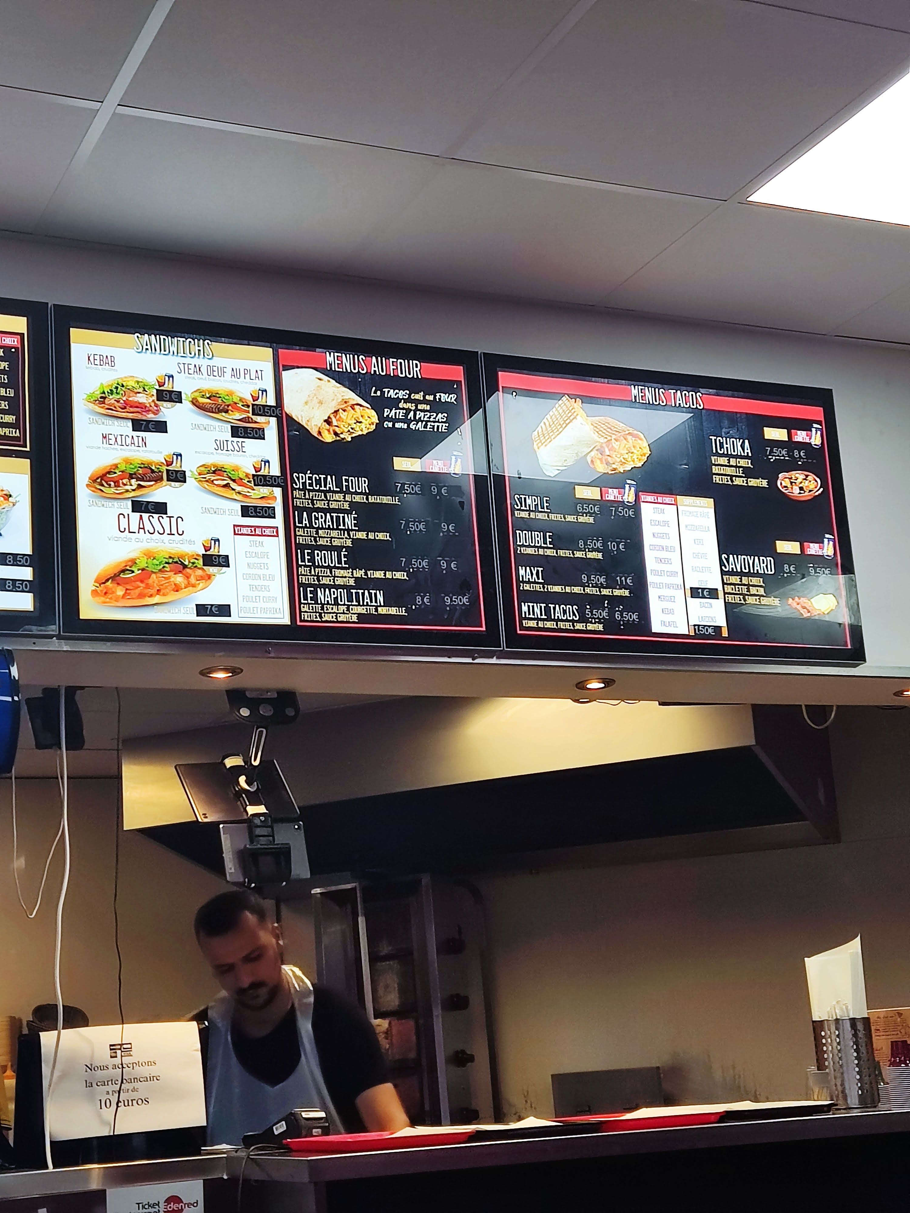 Ma première expérience fut décevante comme vous pourrez le lire plus bas. J'ai accepté l'invitation du proprio à y retourner afin d'affiner mon jugement. La deuxième expérience fut correct, et ma commande conforme, à l'heure d'aujourd'hui je conseille la game des tacos au four. N'y allez pas entre 13h et 14h car ils ne servent pas à cette heure là. Ne vous fiez pas aux menus affiché ce n'est pas du tout respecté, la moitié des ingrédients seront absents de votre sandwich, et frites dégueulasses à prendre en supplément à 1€... J'ai testé une fois, ce sera la dernière. À éviter absolument, il y a un petit casino à 50m où pour le même budget vous mangerez bien mieux...