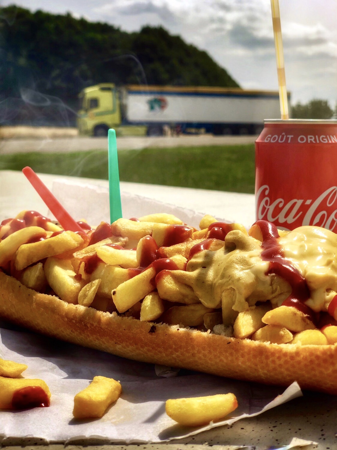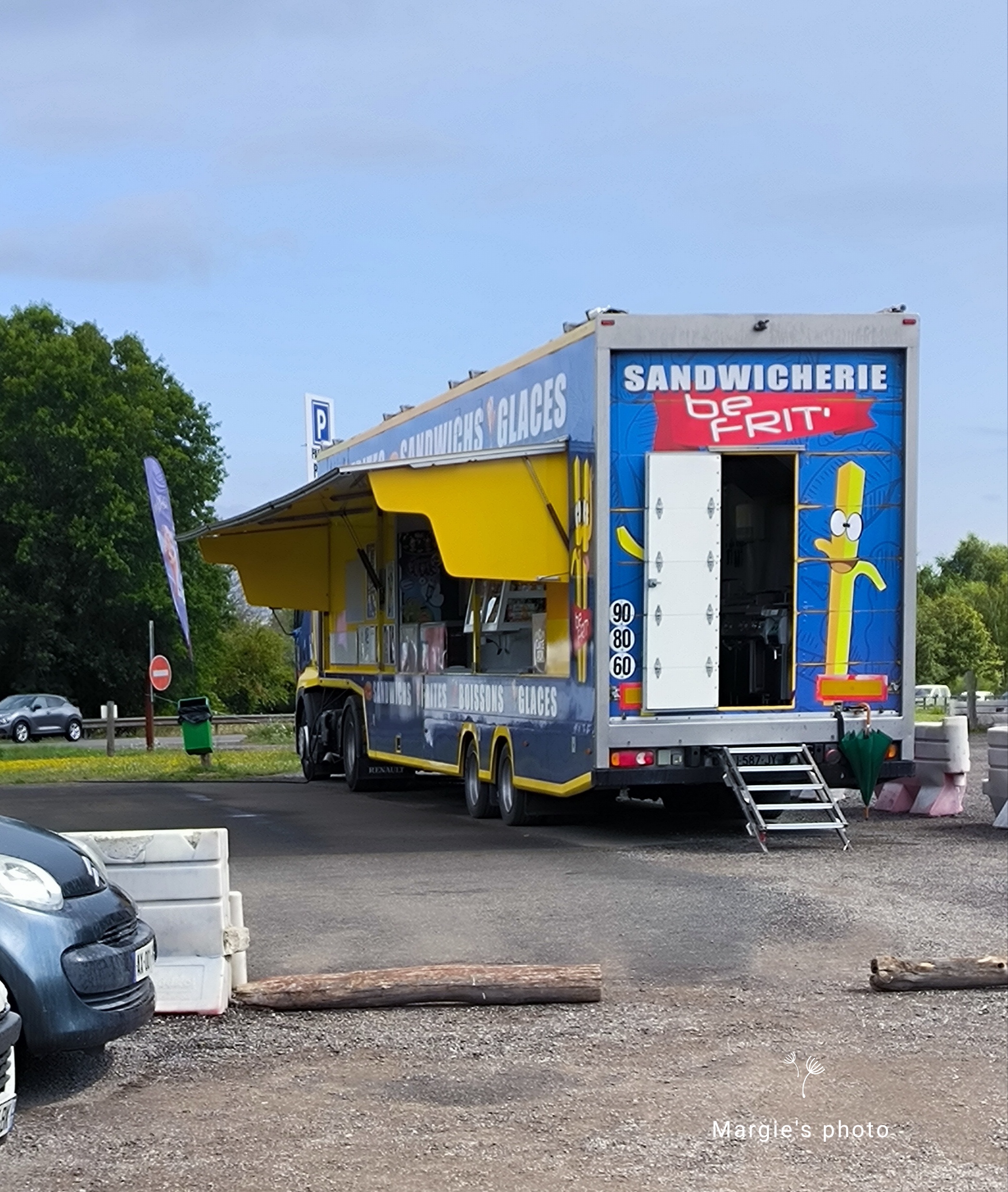 Beau camion et très bon sandwich frites le pain excellent prix très correct et produits frais. Parking pour se garer gratuit si on consomme et des tables pour déjeuner tranquille au soleil