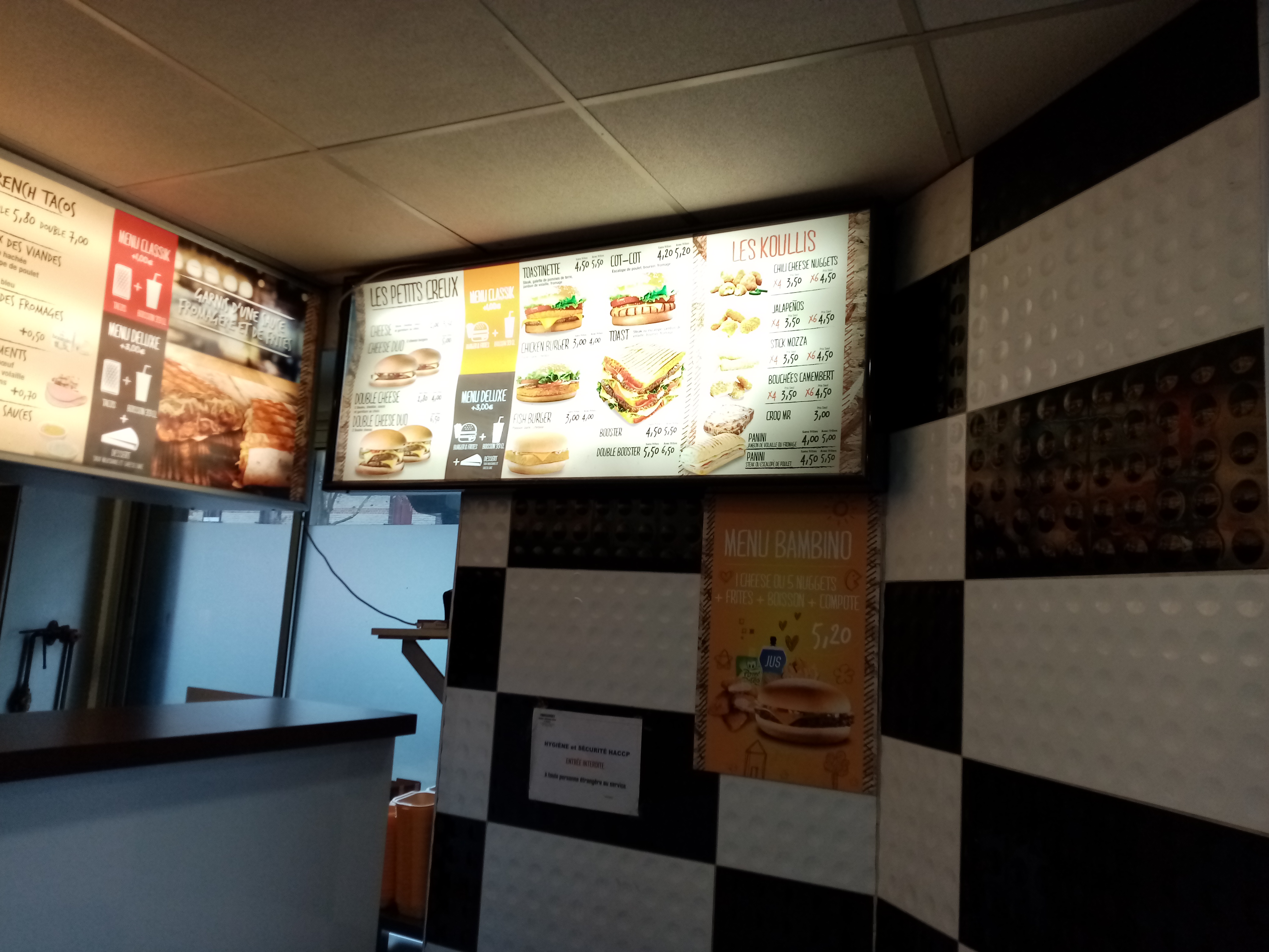 Carte assez étendue et prix très abordable. Quelques tables à l'intérieur pour se poser, plutôt confortable. A été validé conforme aux réglementation hygiène il y a plusieurs années à en croire l'affichage. Déception côté cheeseburger qui étaient bien plus petits que je ne le pensais.