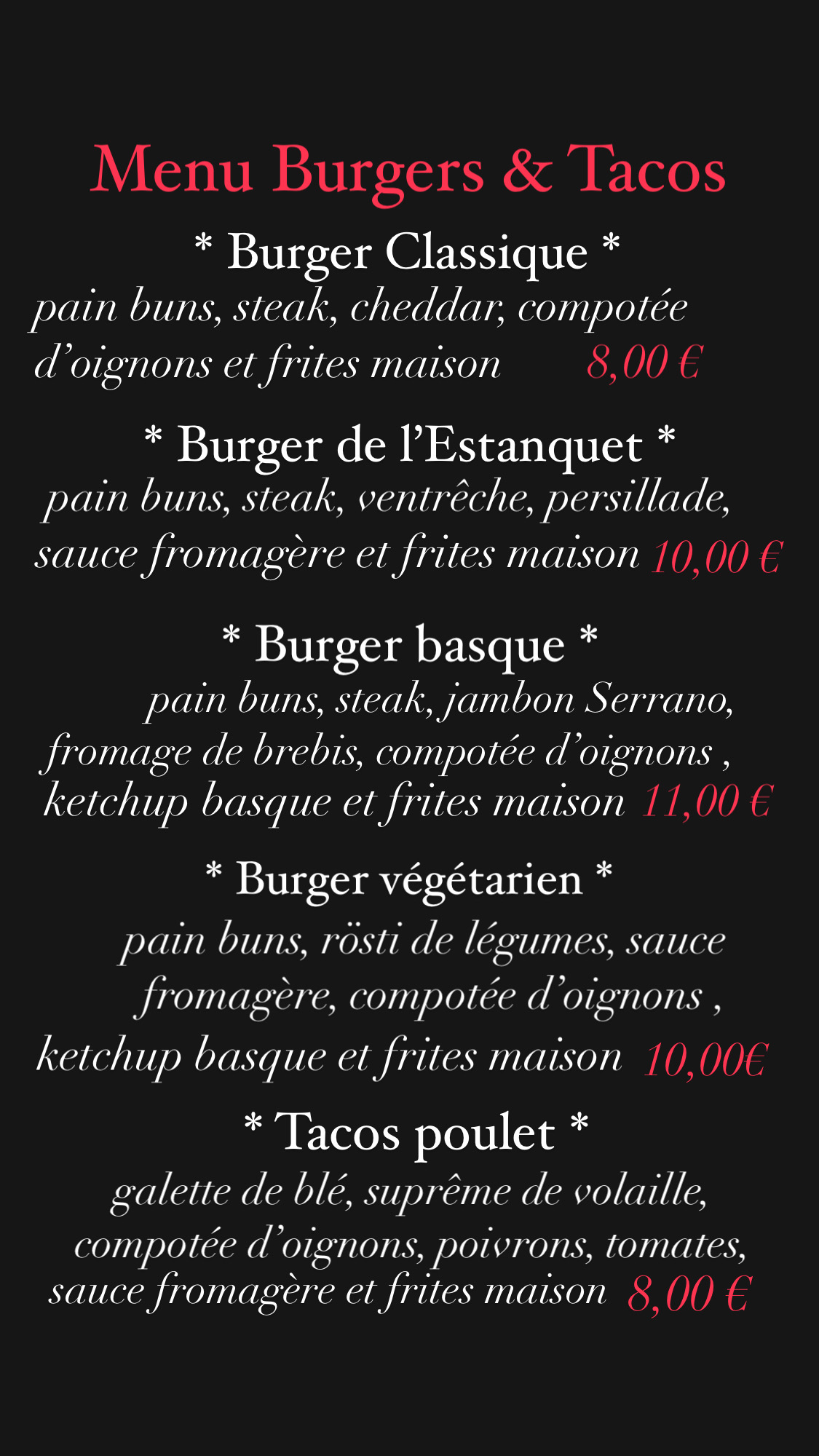 J ai commandé un burger Basque. Sauce ketchup Basque très bonne. Le steak était bon. Les frites excellentes 🍟🍟👍👍 Bon pas très light pour le soir😀😀 Je recommande.