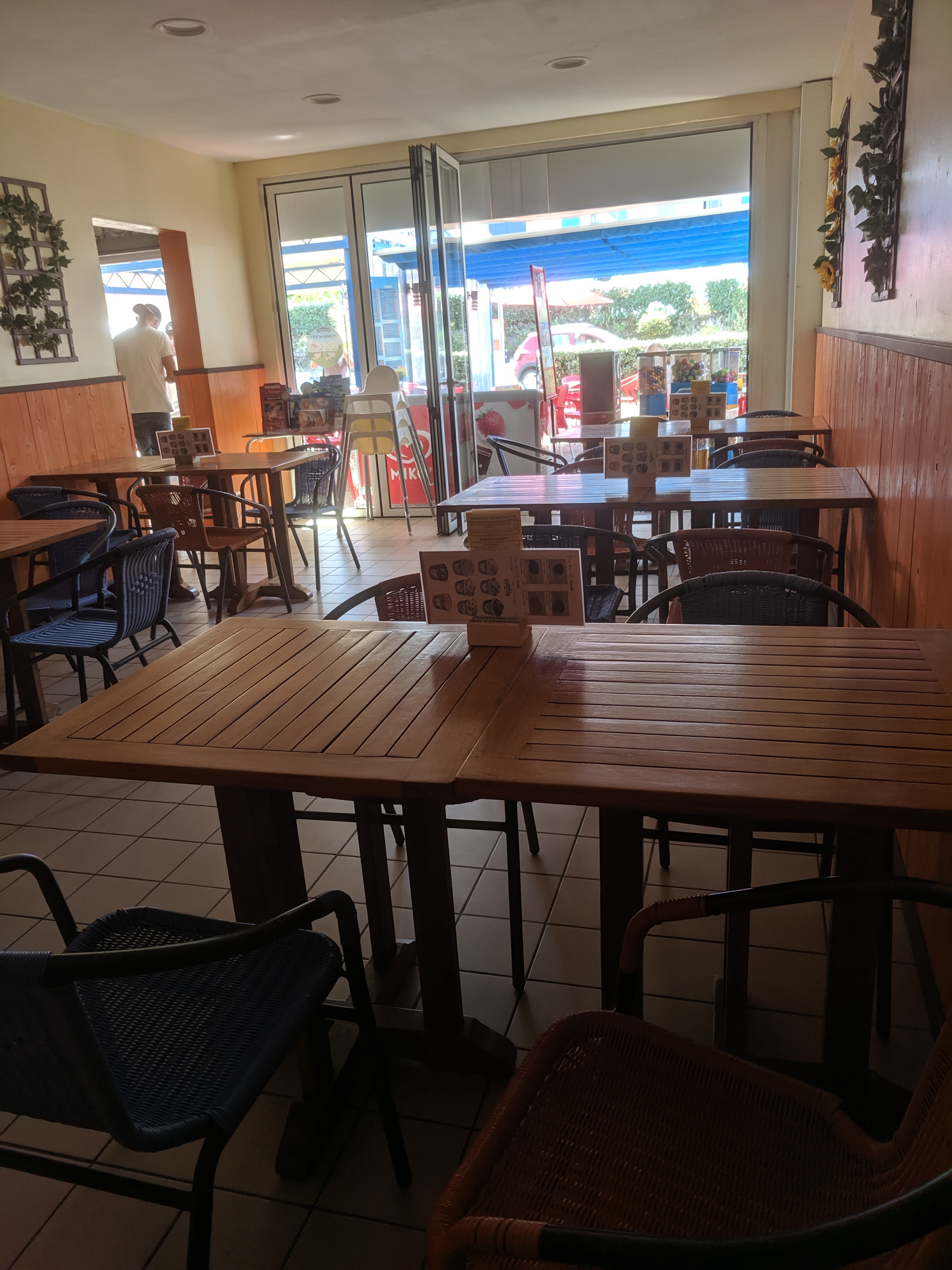 Fait food pas terrible ! Même macdo fait mieux ! Commande de 3 américain !!seul 1 de disponible car plus de pain. Il est 19h30 ils ont encore 3 heures à tenir ! On se rabat sur une assiette viande frites, je demande si c’est possible de mettre de la salade et des tomates pour faire un semblant d’américain ! Un non catégorique m’y est opposé. Arrive 30 mn après le repas steak haché façon mac do très fin et frites surgelées ! Très déçu pour 28€ hors boissons