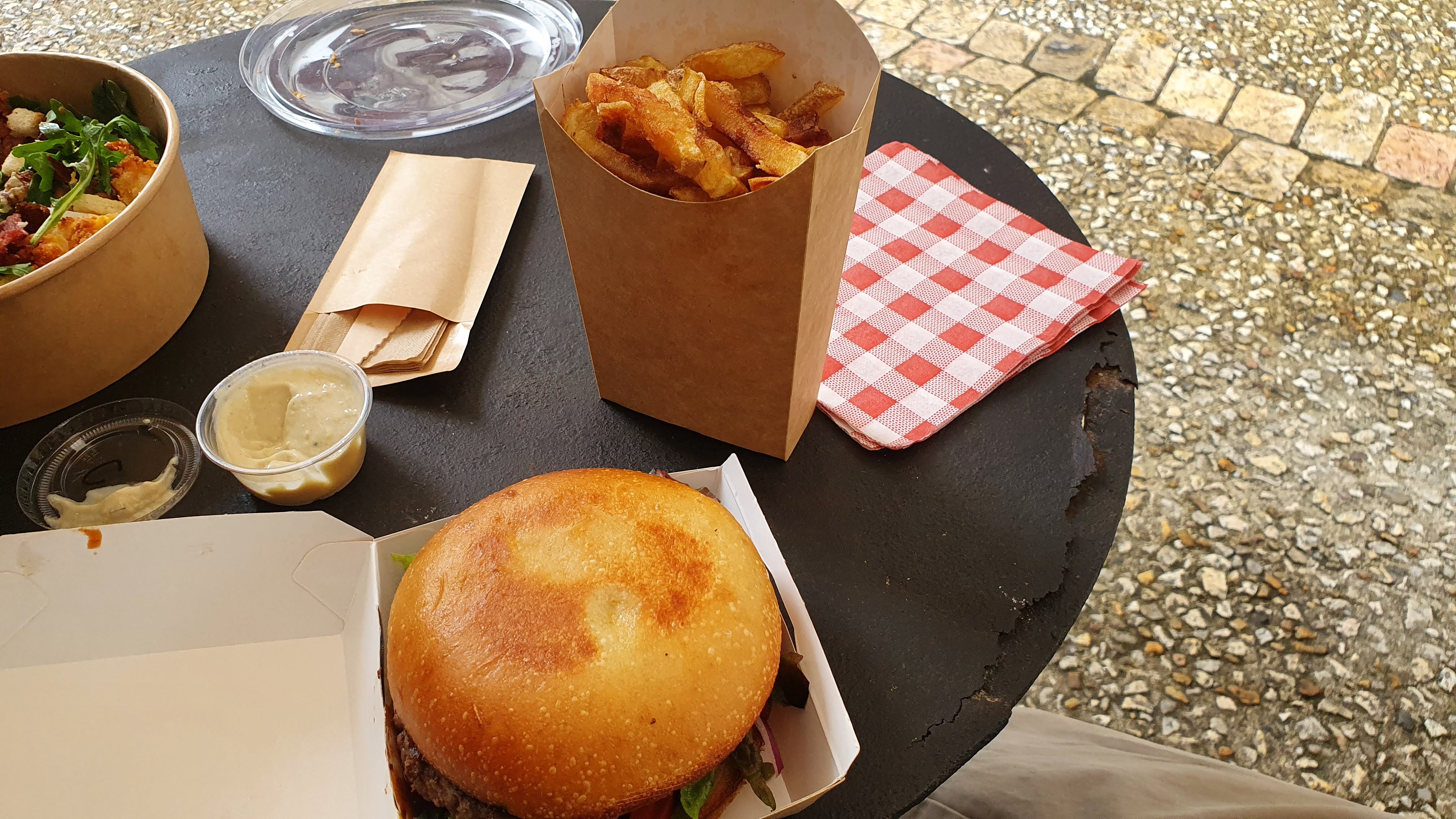 Nous avons pris un burger car le reste était en rupture de stock pour ce repas (nous sommes arrivés un peu tardivement!) Nous l'avons eu en 10 minutes, fabriqué sous nos yeux. Bémol, la viande n'est pas assez assaisonnée à mon goût, et la sauce n'était pas très présente. Il faudrait d'autre sauce, et pour les pommes de terre notamment. Sinon, il était vraiment copieux et le rapport qualité prix est vraiment très bien.