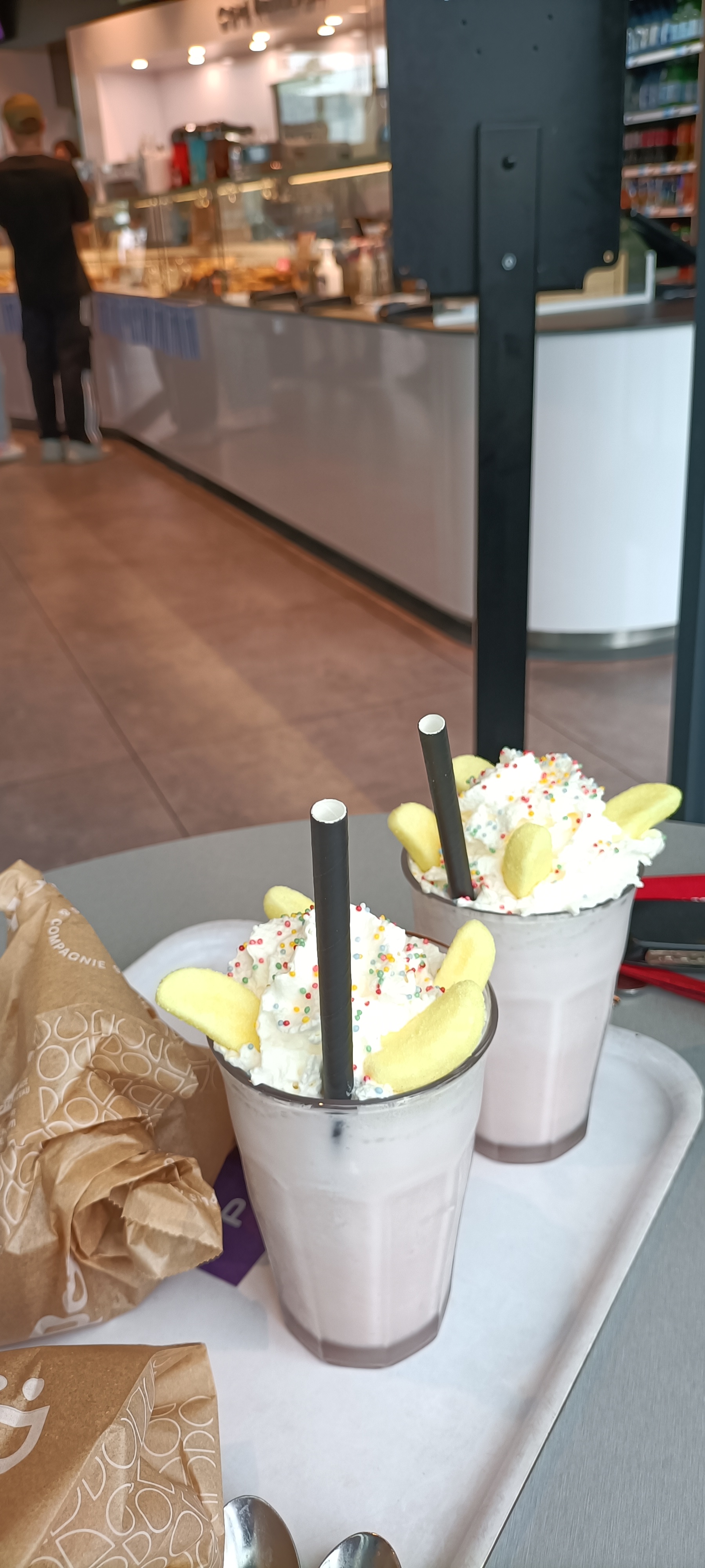 Le goûter était super,chocolat chaud et pains au chocolat mais alors la vendeuse pas souriante et le jeune ,pas très concentré sur son travail.!!!!