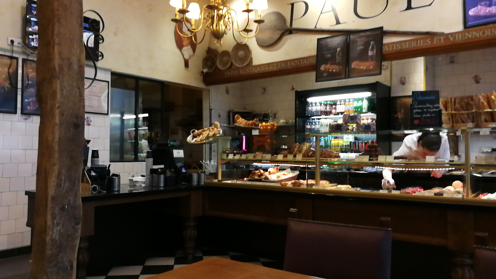 Jolie boulangerie, déco à l'ancienne, pâtisserie, café. Questions pains pour la baguette rien d'inoubliables des baguettes qu'ont trouvent de même goût dans de nombreuses boulangeries