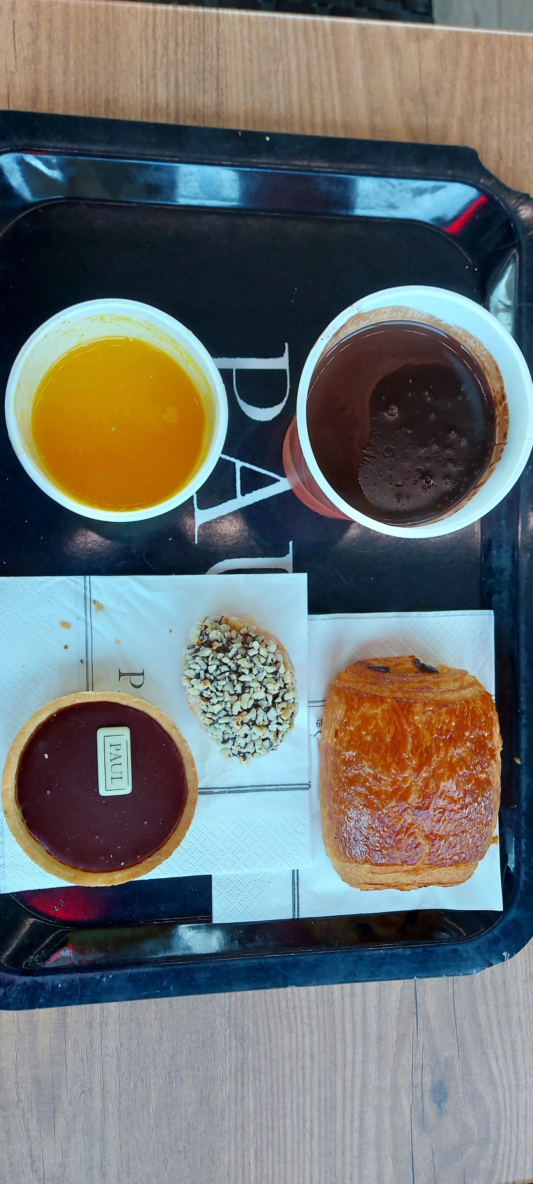 C'est Paul quoi, faut pas s'attendre à un truc exceptionnel non plus. C'est presque tout industriel mais il y a des trucs qui sont bons (les gros macarons, le pain , les beignets , les éclairs, les cannelés qui ont bon goût et sont pas mal, mais ça s'arrête là. ) Les tables sont souvent très salles , les pigeons qui rentrent sans cesse , il faut aussi faire quelque chose. Le chocolat chaud , une fois et très bon (quand c'est la fille qui le fait) , une fois il est moyen est banal (quand c'est l'homme qui le fait ) . Pour le savoir au visuel: quand il le chocolat chaud à une apparence noir c'est qu'il est bon, quand il est marron clair , vraiment pas bon. C'est cher aussi pour de l'industriel je trouve.