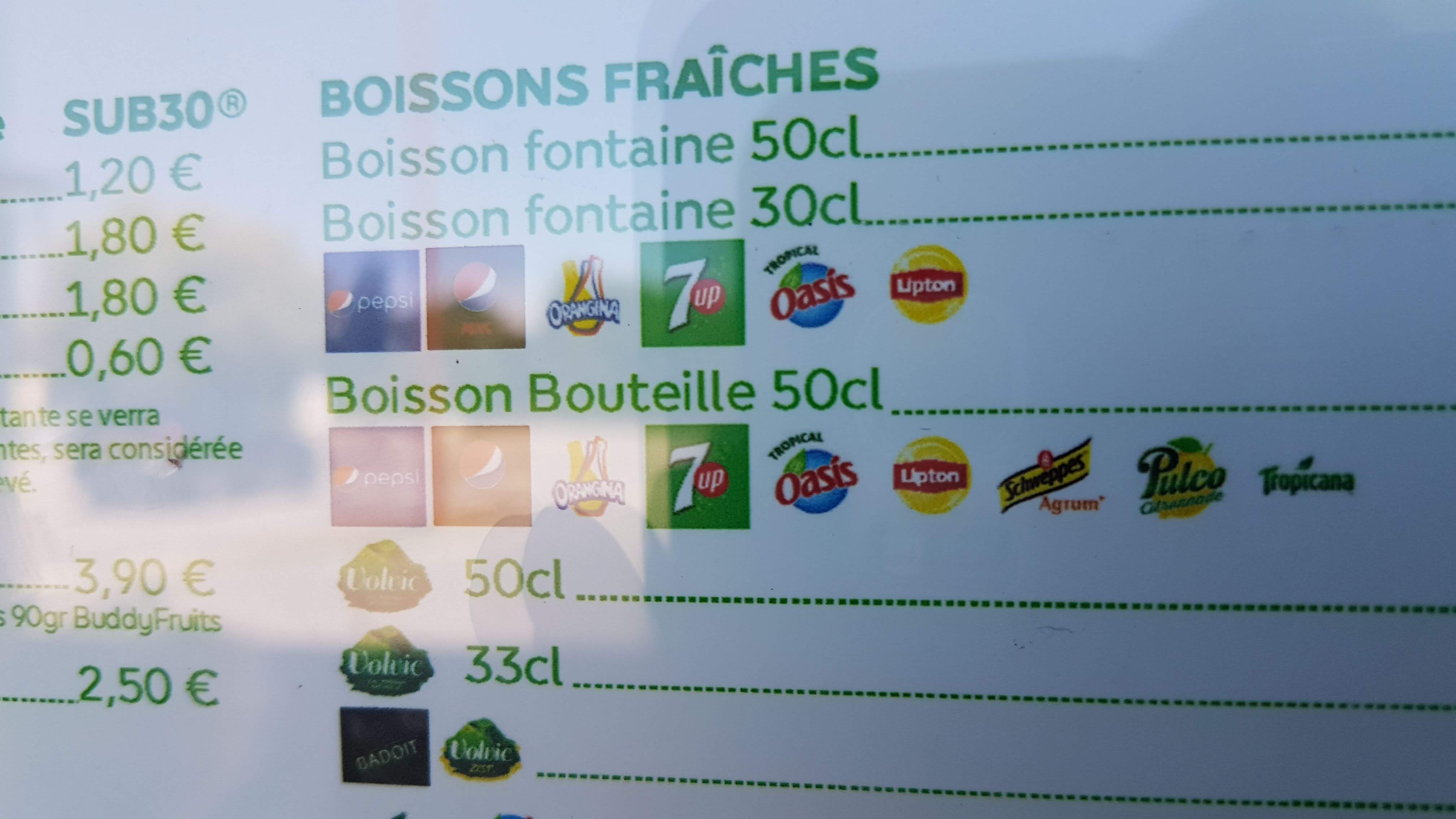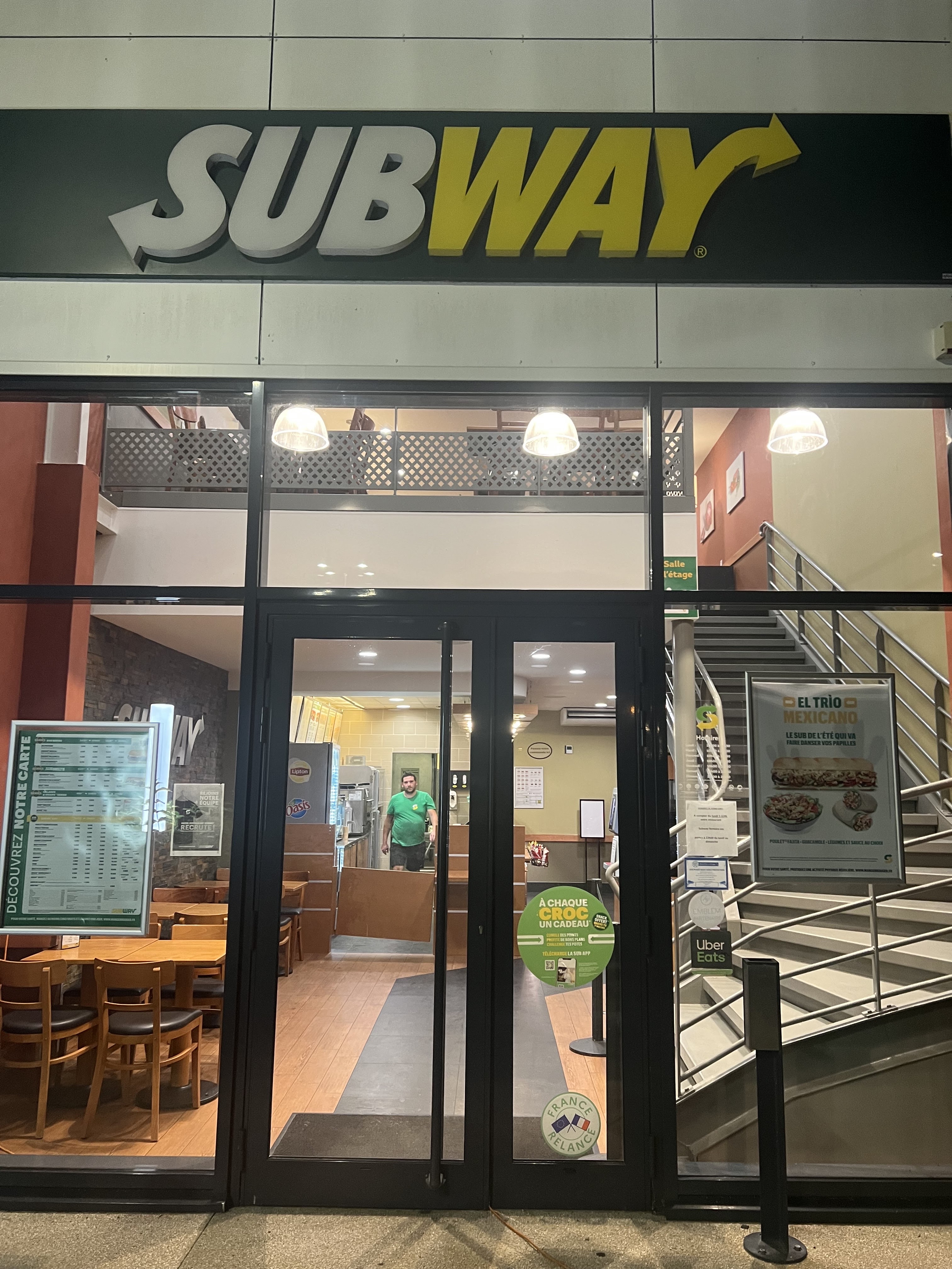 Bonjour Subway une fois pas 2, si vous entrez à Subway mieux vaut connaître les okats prix commande même un 15 août ou y avait pas un chat faut pas que sa traîne comme la 2eme employé qui avait fini son service, plat très bof mais le pire c'est le bruit de la clim les tables pas propre et les traces de gras sur les murs, c'est très cher et pas fameux bref même moi qui suis pas un dingue de la resto rapide je conseillerais même le mcdo par rapport à Subway tellement c lamentable....ah j'oubliais la connections des lampes je suis du métier j'ai jamais vu sa dans un endroit commercial mais cela confirme le reste