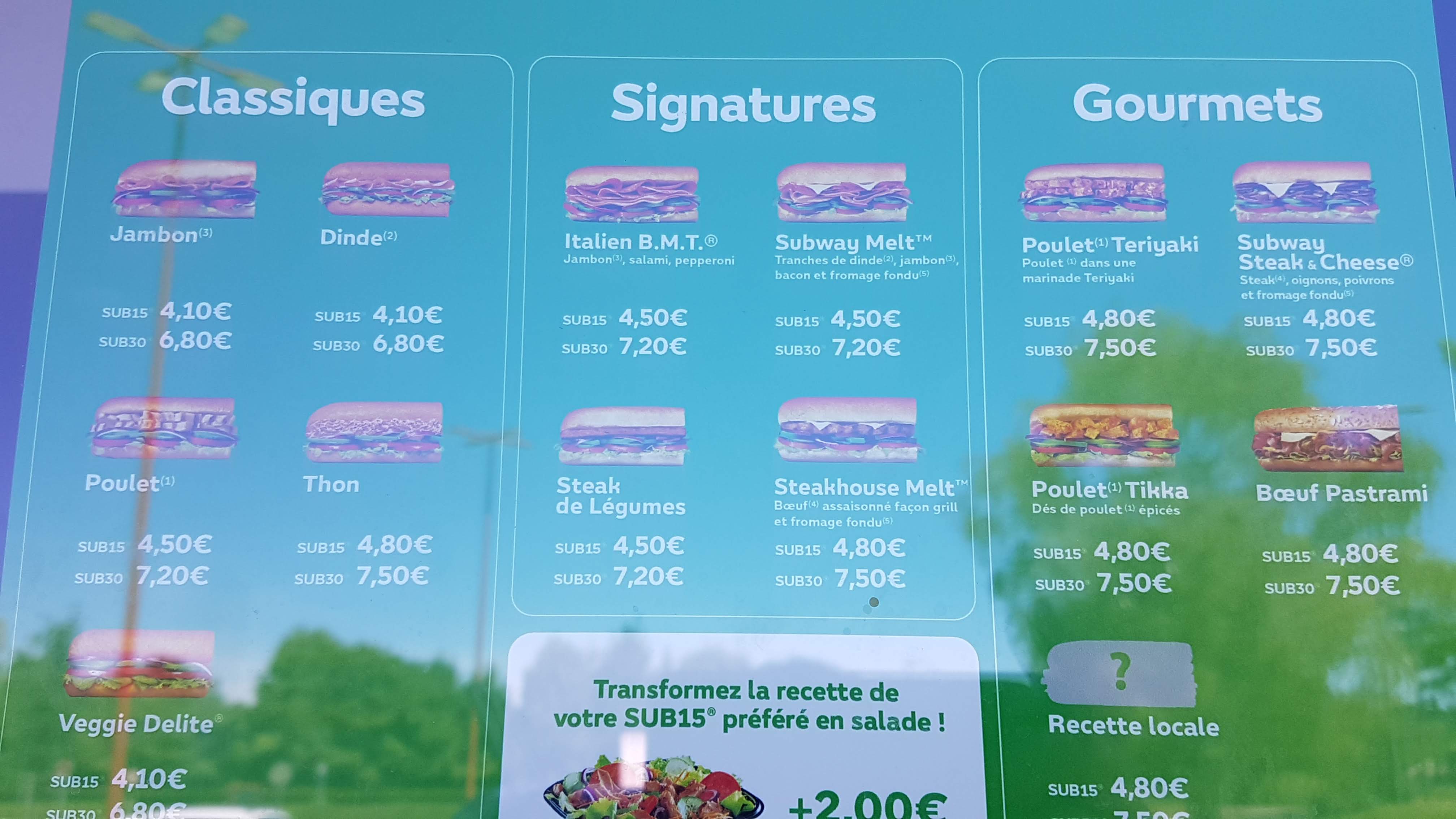 expérience moyenne…Subway ne m’a jamais déçu . Bon restaurant mais je rajouterai un petit manque d’ingrédients au niveau viande qui pour le prix je reste un peu sur ma faim , de plus 2 commande totalement identique et 2€ de différence bizarre . Je recommande si vraiment peu faim