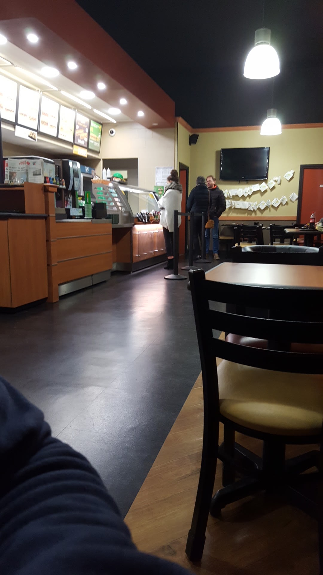 Très déçu. Nous avons l’habitude d’aller à ce Subway régulièrement et ce dimanche 12 novembre, attente de 30 minutes alors que peu de personnes. De plus, la serveuse trempe son t-shirt dans les sandwiches en se penchant, peu hygiénique. Ensuite, plus de crousti, elle les a sortie du congélateur devant nous, mais arrivée chez nous, ils sont encore congelé au milieu… Dommage le serveur avec elle était cependant très agréable. Les cookies, donuts et beignet étaient à l’air libre posée sur le comptoir. Quand elle en a pris un, pleins de moucherons ont volés.