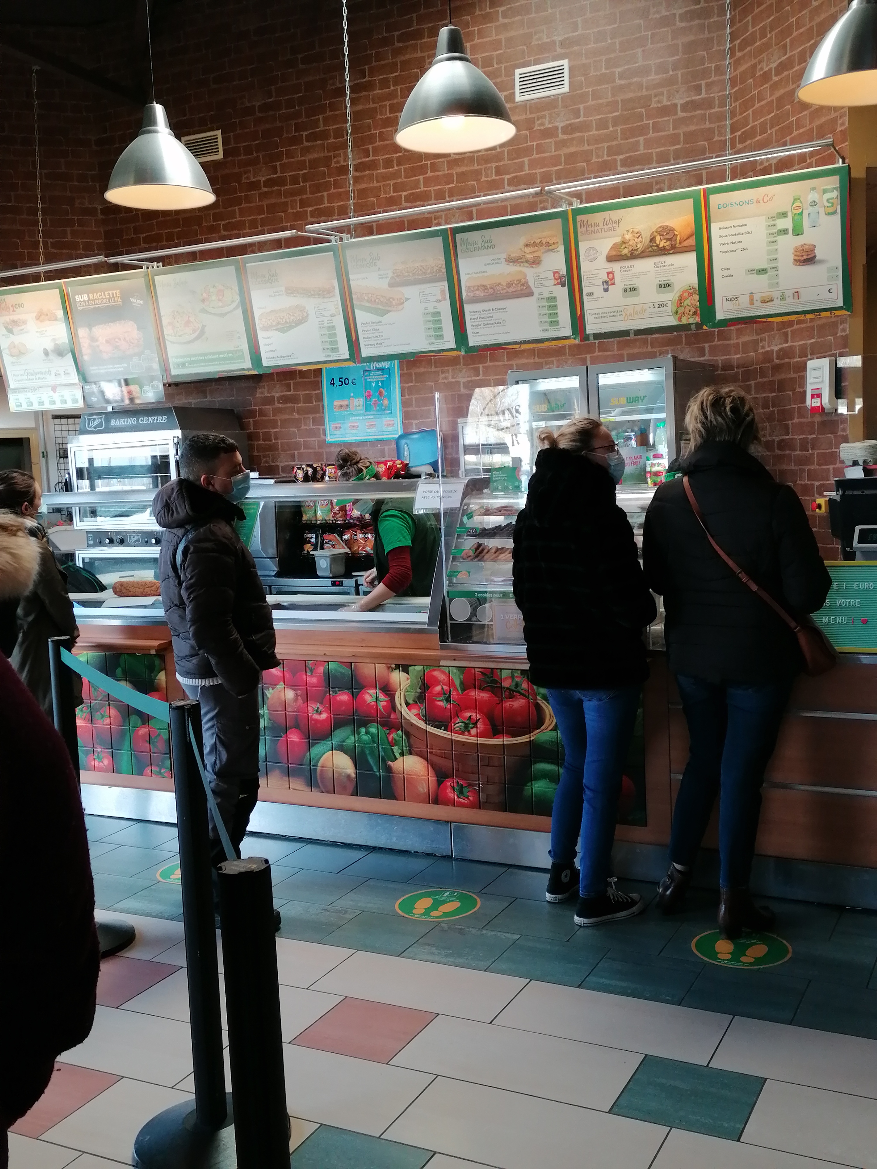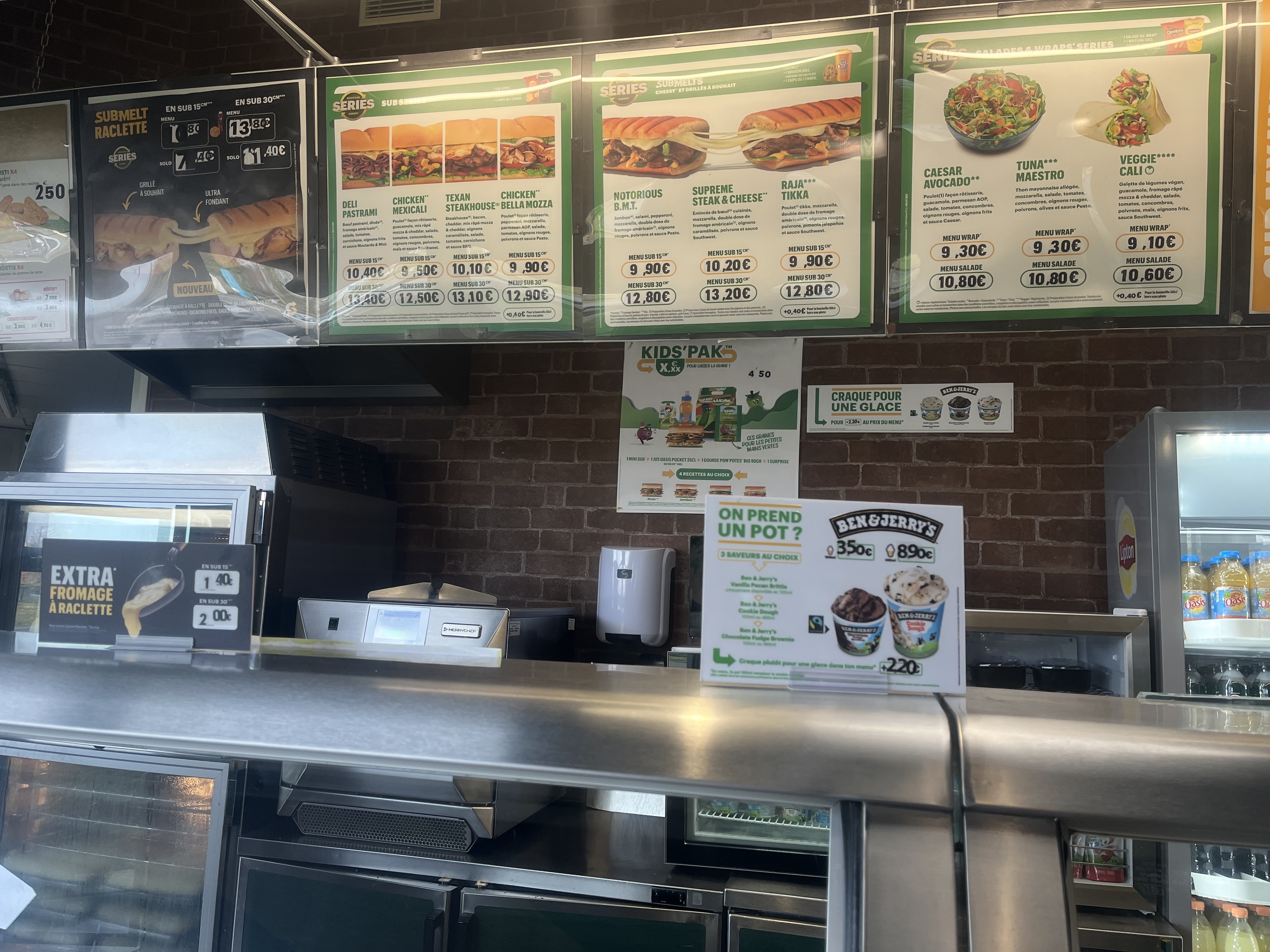 Égal à tous les Subway pas oublier de me demander la taille du sandwich que je veux je me retrouve avec un grand. Pas eu le temps de réagir, bref point négatif on voit la clim qui coule directement côté client dans un bac c’est Cool.