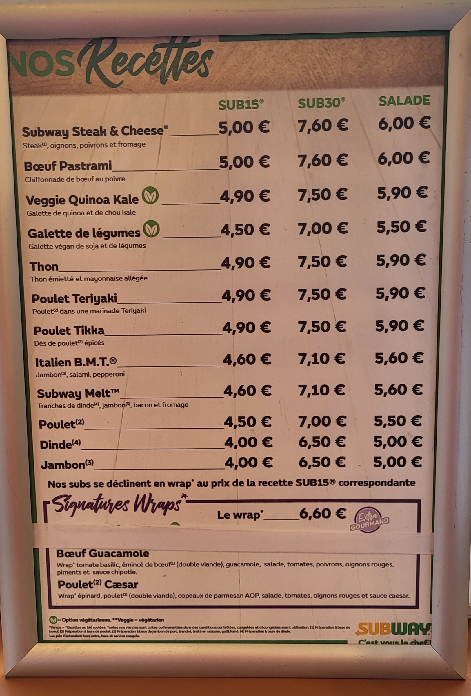 Pas bon du tout ! Après je pense que c'est une affaire de goût mais j'ai était très déçu surtout à ce prix là 😱 le paint faisait limite de la bouillit quand j'ai reçu mon sandwich..Et après avoir demandé un menu étudiant qui était affiché 8.00euros sur le panneau, on ma fait payé 9e70 en m'assurant que c'était le prix du menu étudiant..J'ai essayé de lui en parler mais la vendeuse ne voulait rien savoir et ma demandé de me dépêcher prétextant le monde qui attendais derrière moi. Bref très mauvaise expérience je saurais à l'avenir de ne plus manger Subway, nourriture grasse écoeurante et très cher. Le probleme étant que dans la zone il est très difficile de se restaurer rapidement à proximité à part dans la zone du Auchan.
