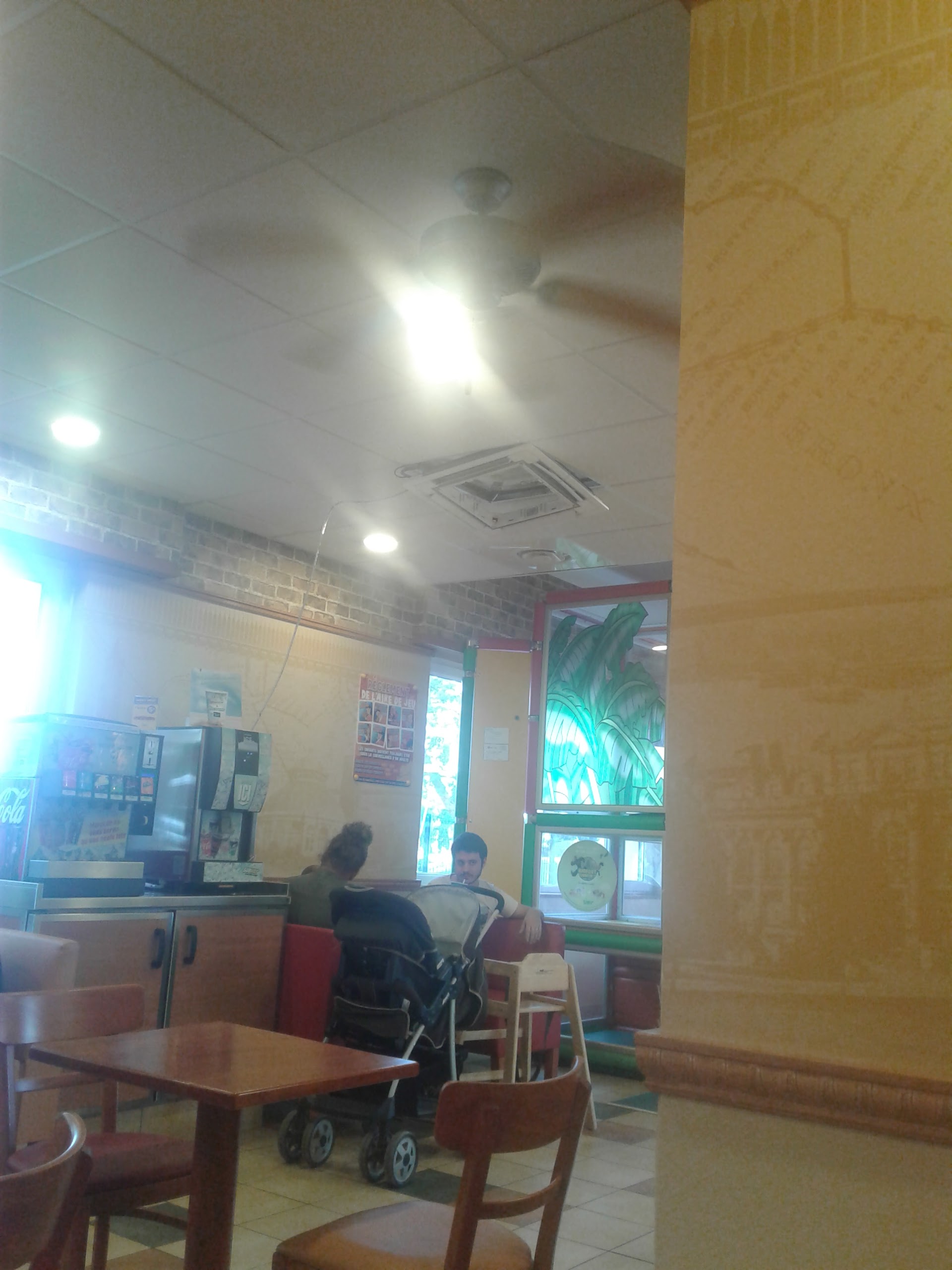 Aujourd'hui jeudi 13 fevrier c'était sal au sol j'ai du demander que l'on me nettoie le sièges rempli de nourriture . Le.sol je parle pas , la fille fausses blonde au chinion et au sourcils dessinés a la main et desagreadés mon sandwich était congelé a l'intérieur quand on me l'a réchaufferer mon pain et revenu a la.limite du brûler . On a linpretion qua'les gens.vienne faire leur T.I.G