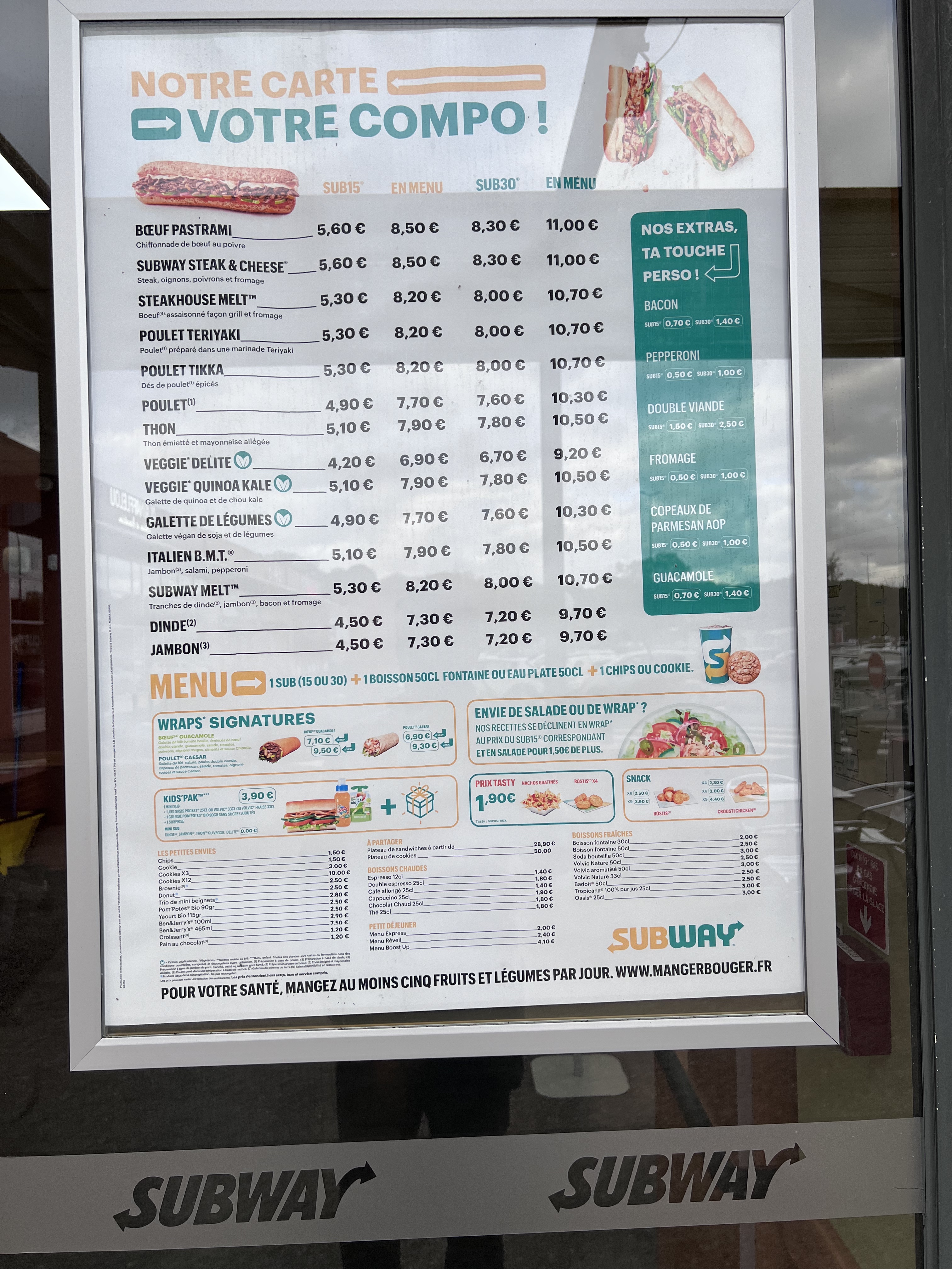 Le restaurant est vide et pas de queue ce qui, au vu du nombre de restaurants autour, devrait nous avoir alerté. Sceptique sur la préparation des sandwichs, garniture et sauce chauffés avec les viandes et fromages… Prix non affichés en caisse pour savoir ce qu’on doit payer, pas de ticket de caisse, uniquement le ticket de CB proposé donc pas de détail 39€ pour deux sub30 hors menu, un menu enfant et 3 cookies Comme nous ne sommes pas des vaches à lait, on ne reviendra pas
