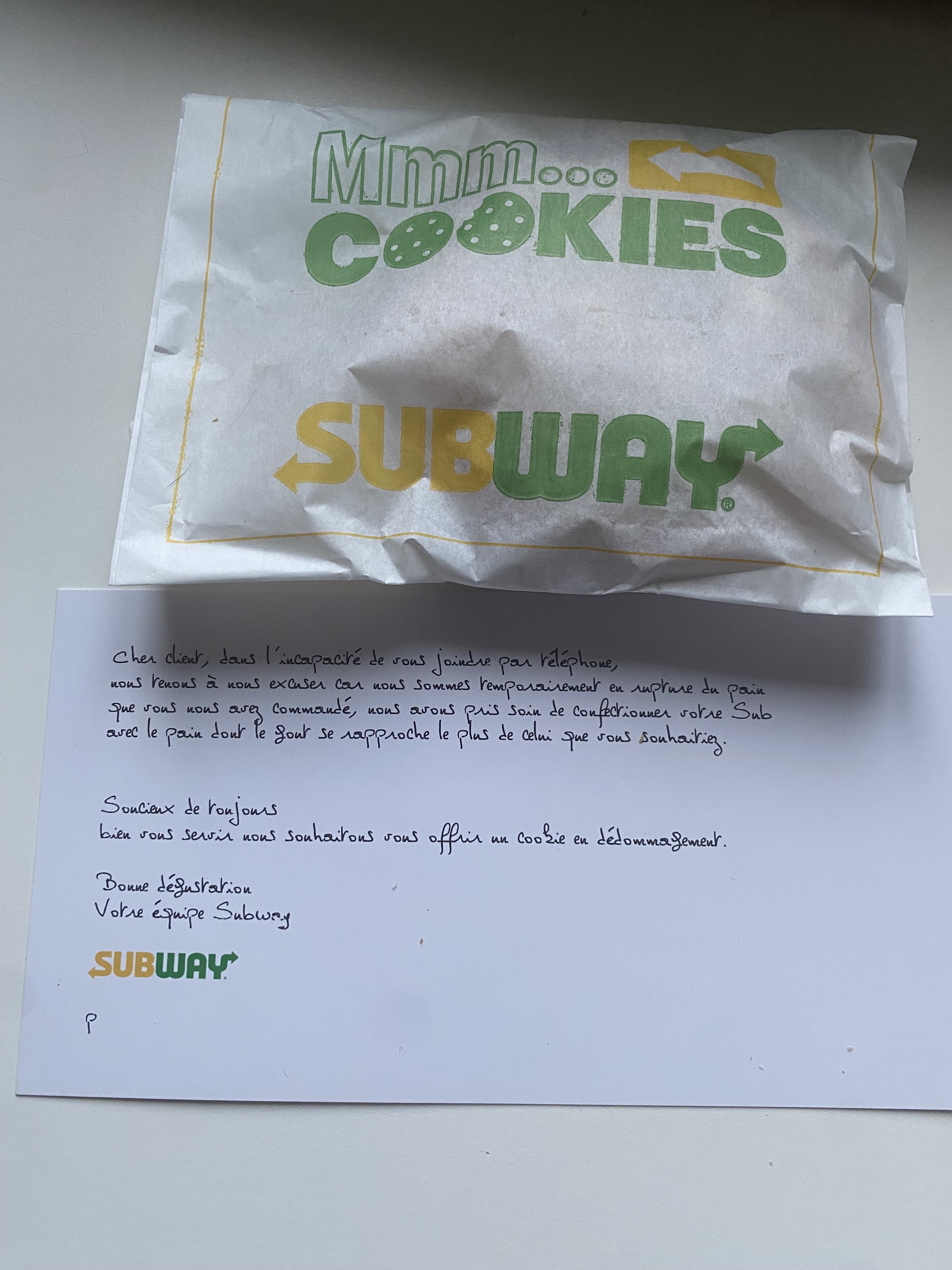 J'ai été dessus car j'ai jamais eu de pain dure mais la cette fois-ci c'était pas terrible. Et plus de cookies au macadamia il était 15h 😕. Donc un petit mot à subway faite attention à la cuisson du pain merci