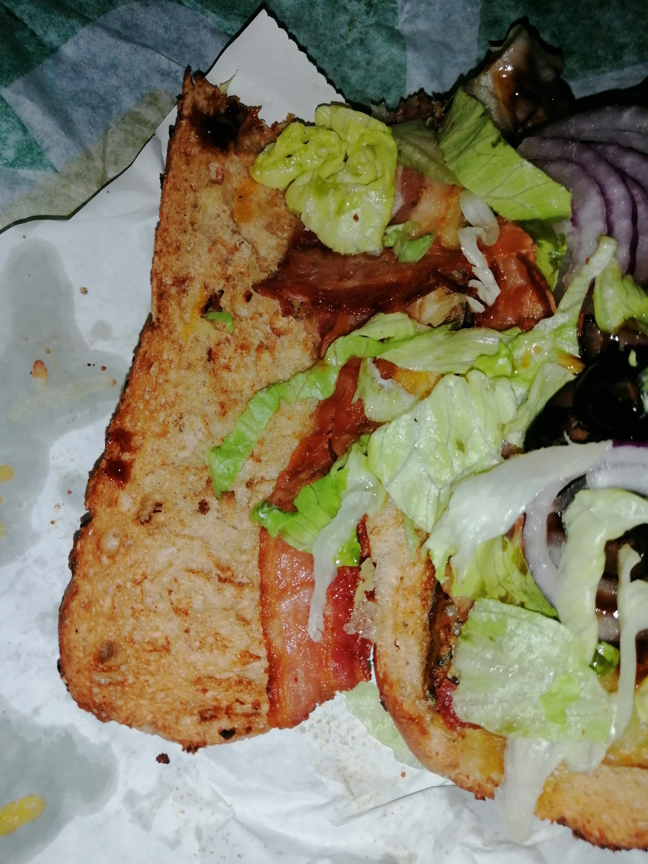 Végétariens méfiez vous, j'ai pu découvrir deux morceaux de bacon bien cachés dans mon sandwich aux galettes de légumes