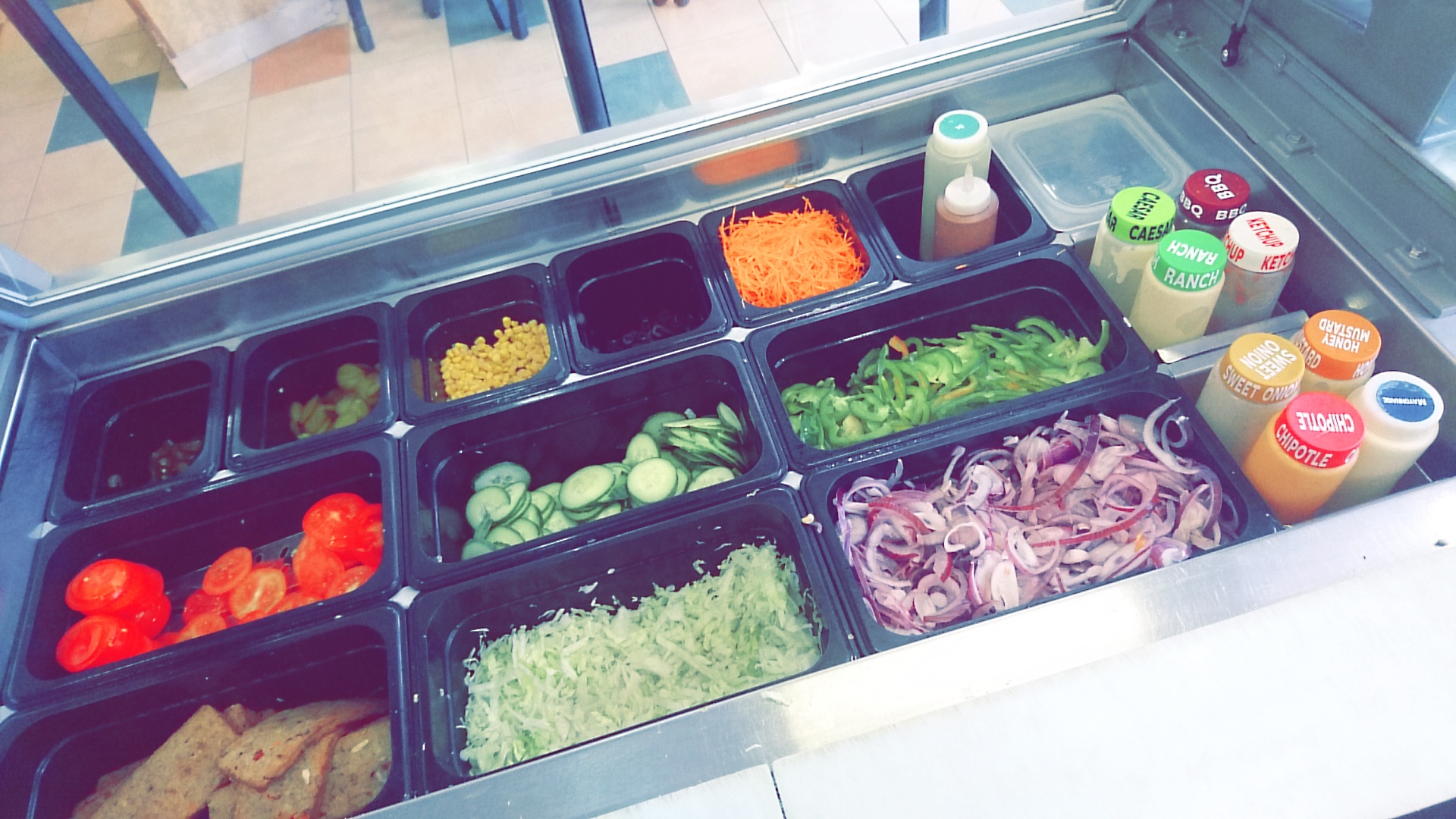 Bon d'accord, on n'est pas dans un temple de la gastronomie mais avec un peu d'astuce on peut manger sainement : pain, protéines et légumes. Il reste à éviter les sauces les plus caloriques telles que la mayonnaise et également faire l'impasse sur les chips et les cookies et voilà vous voilà nourris sans excès. L'accueil est juste comme il faut : attentif et avec le sens commercial. Le service a été rapide. Il est y 13 heures, un jour de vacances scolaires. Allez c'est votre tour de choisir votre pain, votre viande (ou steak de légumes), vos légumes et vos légumes.