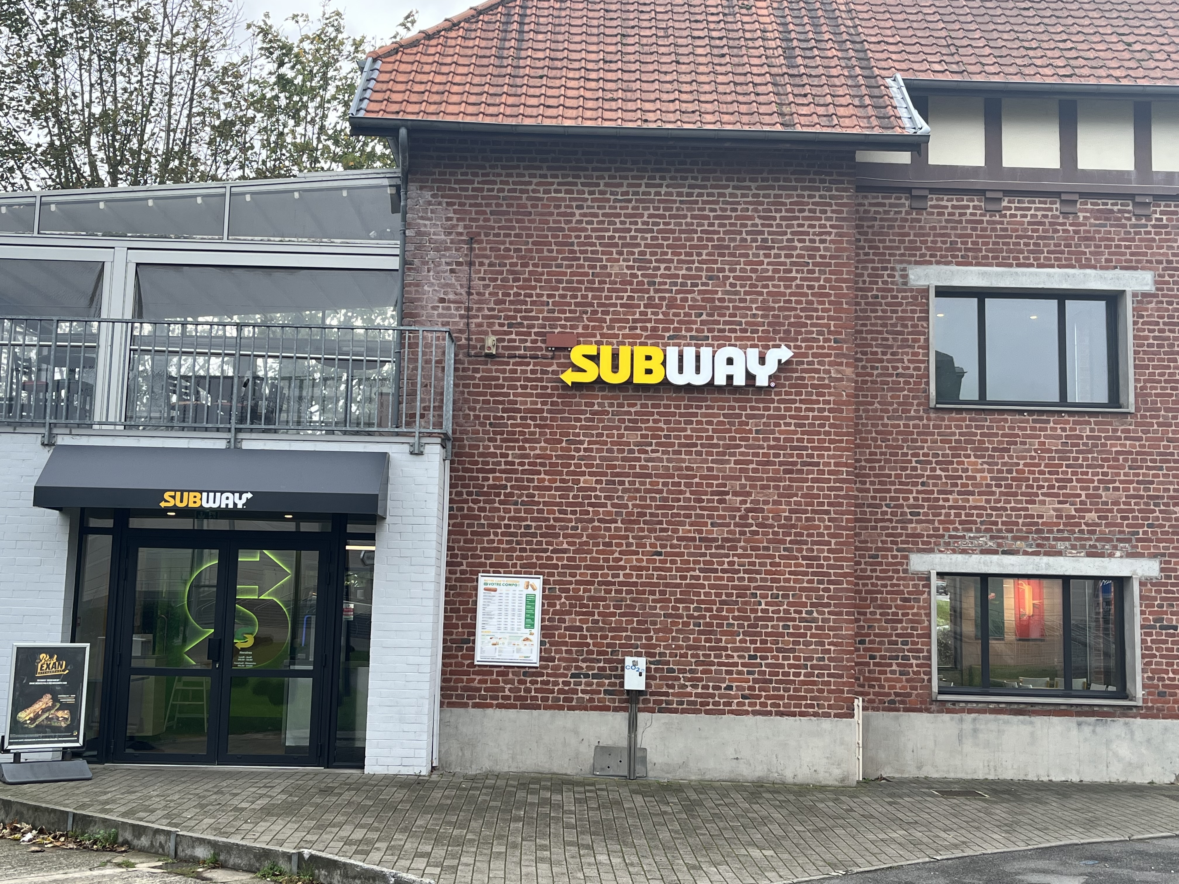 Bon Subway avec terrasse à l'étage ouverte et belle vue du Kinepolis.