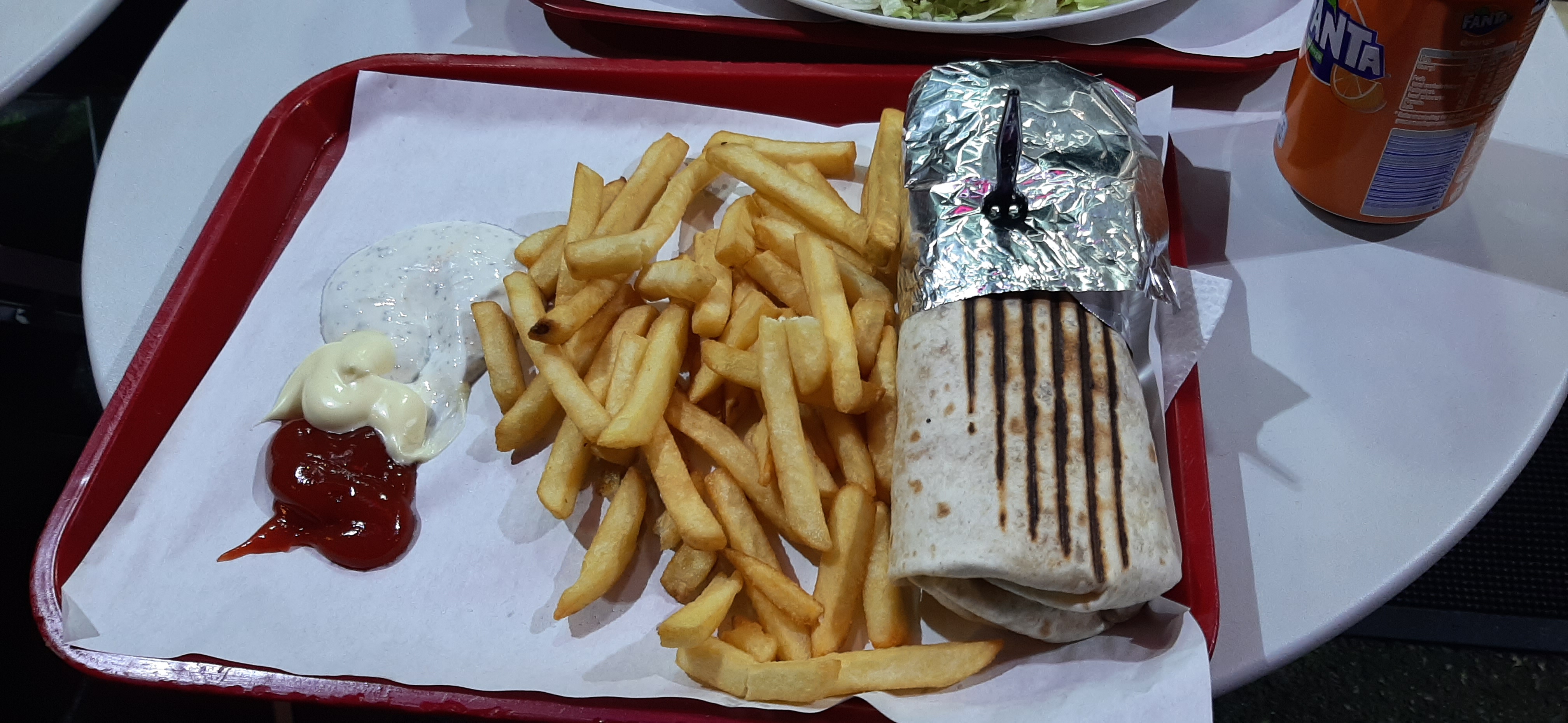 Kebab vraiment pas bon et frites qui baignent dans la sauce.